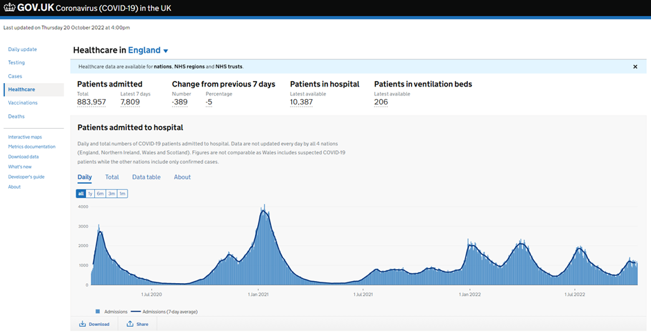Where does this unlikely sounding data come from? Well, I’m delighted to tell you it’s hidden in plain sight in the Government’s Coronavirus Dashboard. Figure 2 reproduces the familiar graph that you see if you visit the website and click on the Healthcare tab.