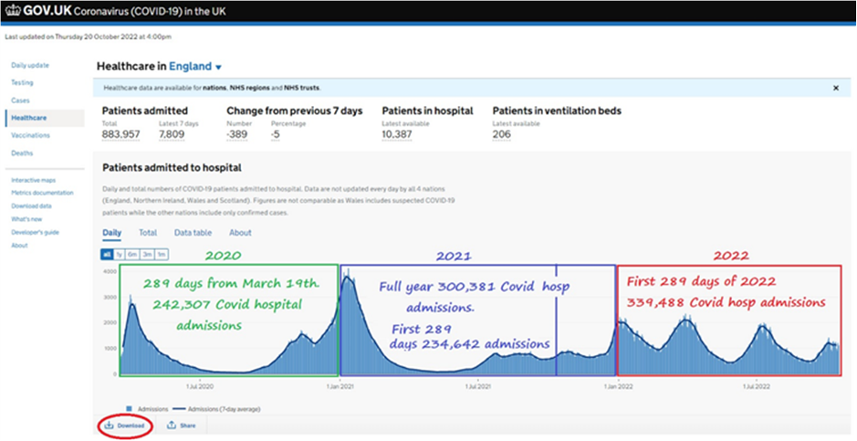 I know some readers like to verify the data themselves. To do so, go to the Coronavirus Dashboard, click on the Healthcare tab. Then click on the ‘Download’ button in the bottom left hand corner and extract the data as a csv file, which will open in an Excel spreadsheet. You can then reproduce any of the charts printed here. In figure 3 I’ve circled in red the ‘download’ button and I’ve highlighted the time periods I’ve shown separately back in Figure 1.
