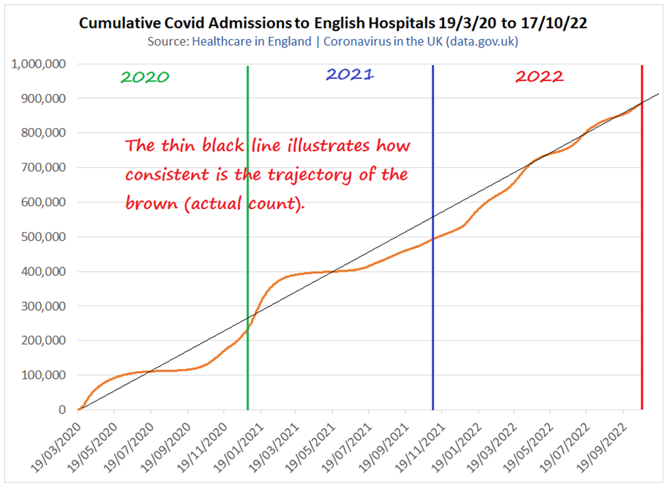 We can also simply present the data cumulatively (see Figure 4). If you draw a line from the bottom left-hand side to the top right hand corner you’ll notice that the trajectory of the line is a very close fit to the actual wavy line of hospital admissions. The straight line is indicative that hospital admissions are accumulating over time at a constant rate (albeit with waves on the way).