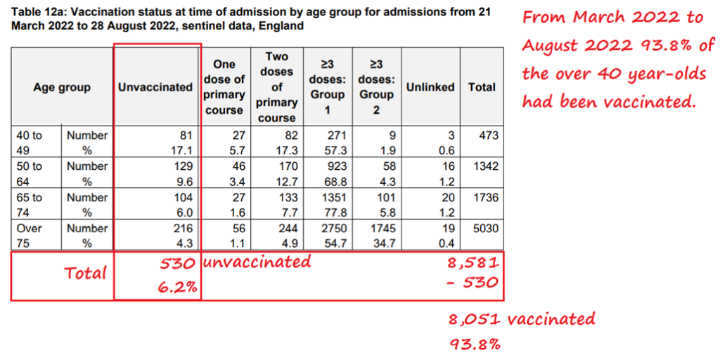In the same report, though admittedly 35 pages further on, the actual number of hospital admissions by vaccine dosage is shown in table 12a. The figures are for about a five month period from March to August 2022. Only 6.2% of the people hospitalised were unvaccinated. As we know, there’s an ongoing dispute about the actual level of vaccination. For the over 40s the rate is probably somewhere between 80% and 90%, so whichever way you look at it the vaccinated are proportionately more likely to be hospitalised with a positive Covid test than the unvaccinated are. At most, 90% of the over-40s are vaccinated yet they account for 93% of those admitted to hospital (though admittedly there is a degree of age confounding here, as older people are more likely to be vaccinated and also more likely to be hospitalised).