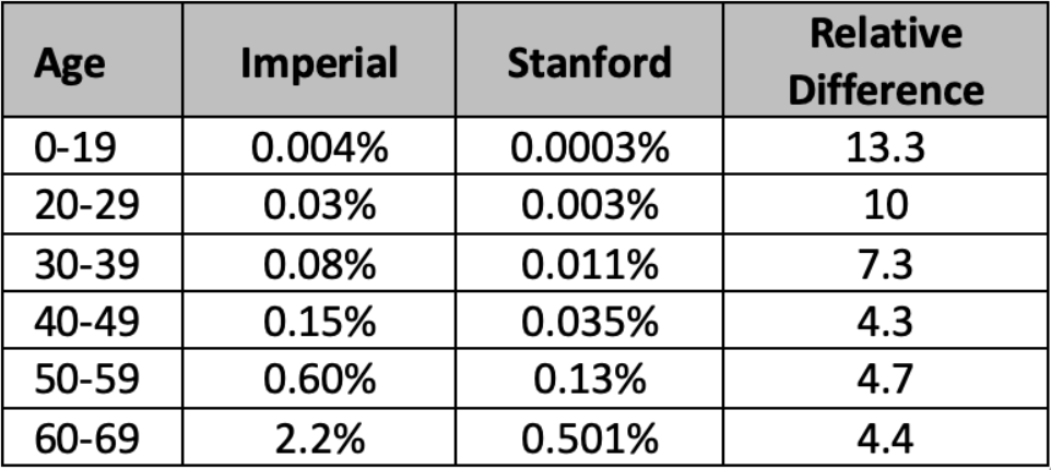 We compared the two IFR estimates, which shows the Imperial College estimates are much higher than Stanford’s across the age groups.