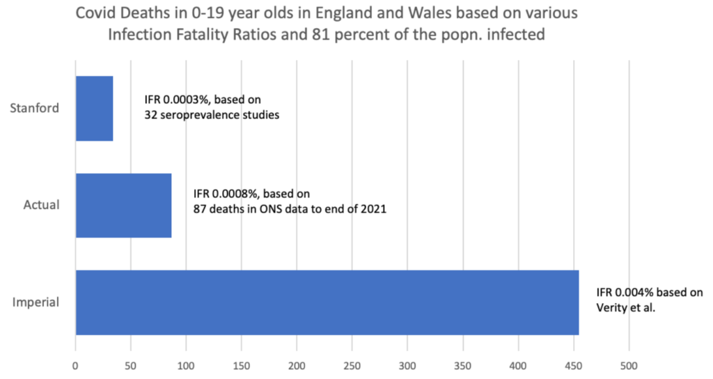 An analysis distinguishing causation in under 18s, as opposed to those who died of another cause but were coincidentally infected, reported a mortality rate in under-18-year-olds of two per million – an IFR of 0.0002%, 20-fold lower than Imperial’s estimate for under-19s. This suggests Covid is the underlying cause of death in only about a quarter of young people when it is registered on the death certificate.