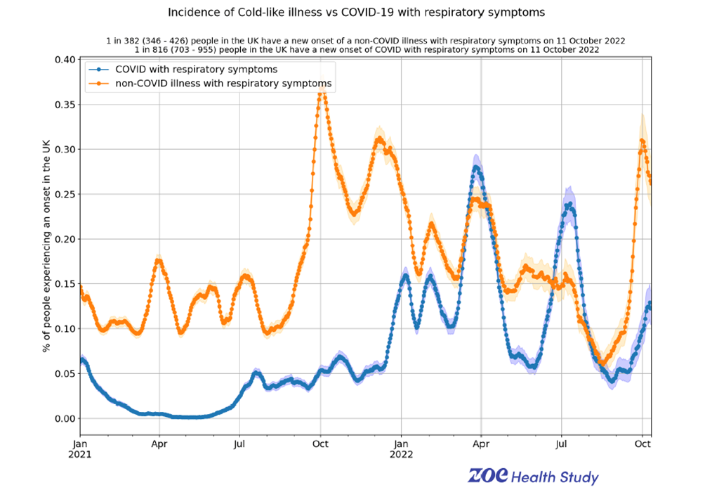 One interesting piece of circumstantial evidence pointing towards viral interference is the incidence rates of ‘other respiratory infections’ compared with Covid infections. These data are seldom gathered because ‘colds’ are usually rather inconsequential and the assumption is there would be no link with Covid. However, data from the Zoe Symptom Tracker might suggest otherwise.