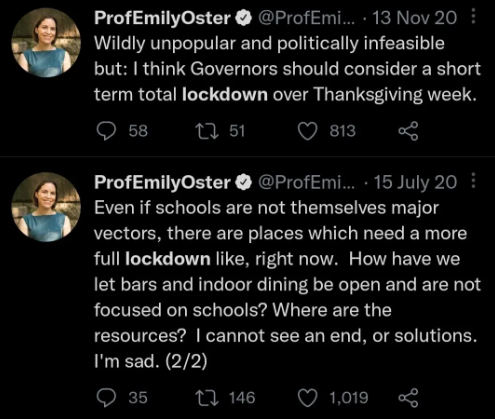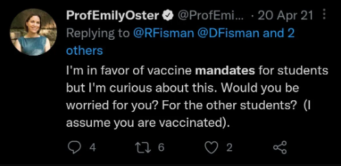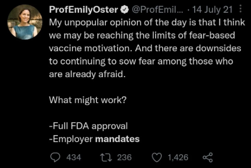 Third, there’s some question as to whether Oster herself really did know better at the time. Like many other mainstream Covid voices, Oster had long been closely attuned to Covid data showing that these mandates did not work, yet she often seemed reluctant to share that data insofar as it contradicted the mainstream orthodoxy that mandates were necessary. In that sense, the policy prescriptions of Oster and those like her may have had less to do with ignorance than with cowardice, tribalism and “following orders”, which can’t be considered acting “in good faith”.