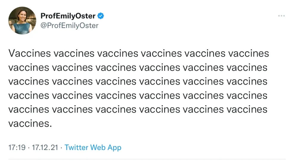 Oster ticks all the boxes here. She was a star student and athlete in her school years, and her public presence is about projecting a pro-social, positive conformist image, while using superficially analysed Science and Data to calm neurotic mothers worried that they’ve strayed beyond the boundaries of what is medically optimal or socially acceptable. She doesn’t like closed schools very much, but she just loves vaccines.