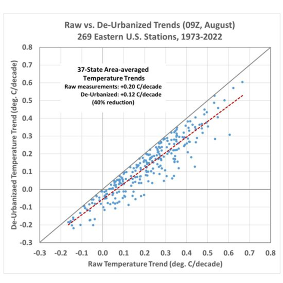 The widespread use of regularly adjusted global and local surface temperature datasets showing increasingly implausible rates of warming has been dealt a further blow with new groundbreaking research that shows 50% less warming over 50 years across the eastern United States. The research attempts to remove distortions caused by increasing urban heat and uses human-made structure density data over 50 years supplied by the Landsat satellites. The 50% reduction in the warming trend is by comparison with the official National Oceanic and Atmospheric Administration (NOAA) homogenised surface temperature dataset.