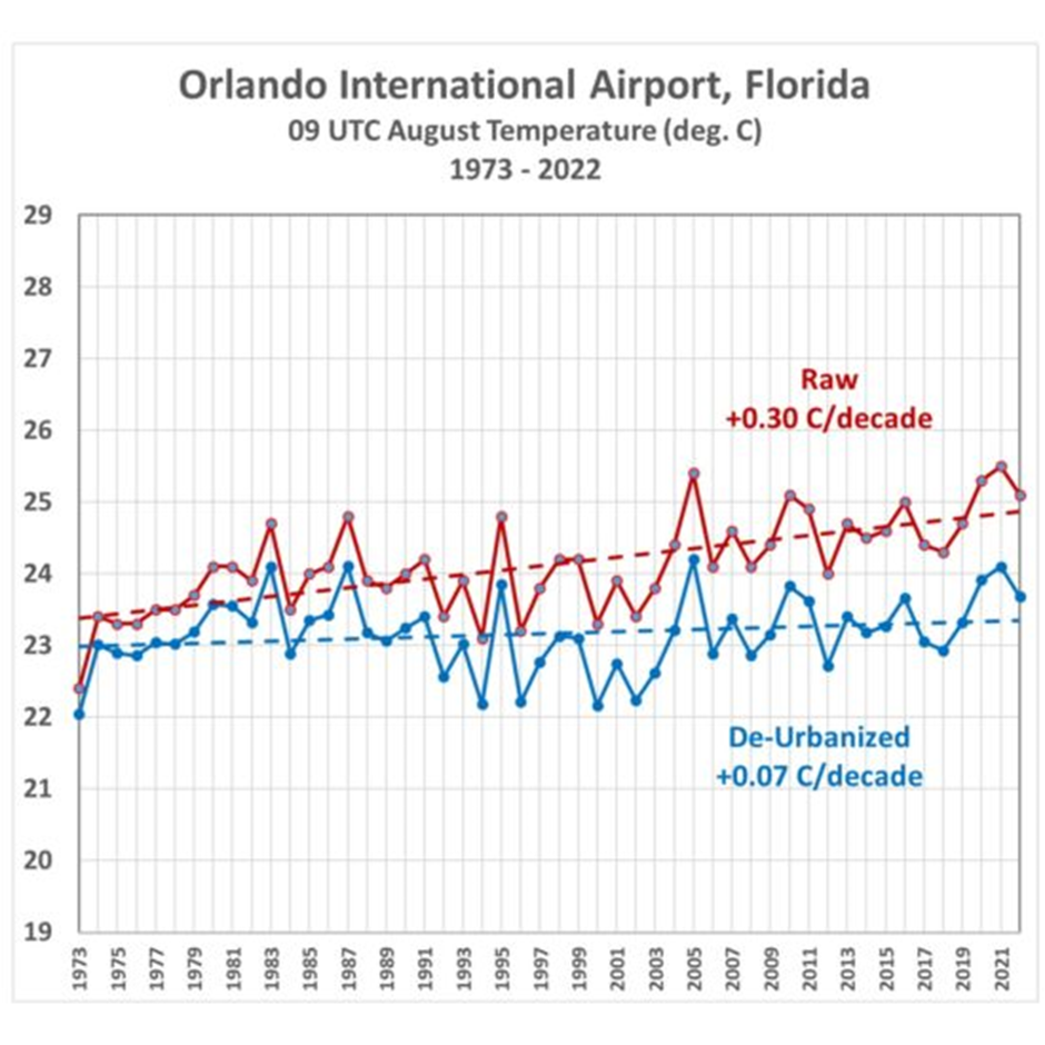 The raw data for Orlando International Airport in Florida show a massive 0.3°C warming per decade, but this falls to a de-urbanised figure of just 0.07°C.