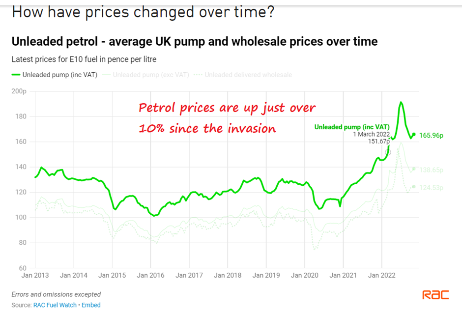 Petrol prices are about 10% higher now than they were at the time of the invasion.