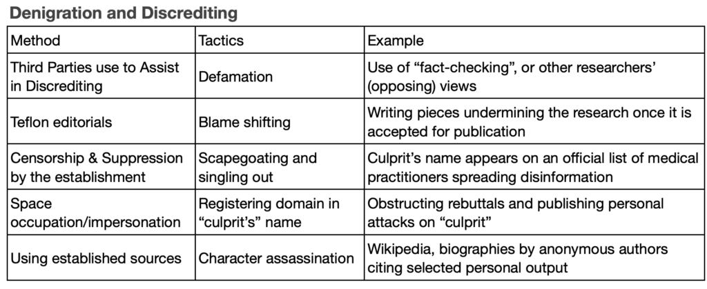 Participants reported 12 censorship and suppression tactics used by the medical establishment and the media due to their critical or unorthodox positions on COVID-19. Our analysis is that these fall into three broad categories: Silencing and Censorship, Denigration and Discrediting of an individual and Complaints and Intimidation.