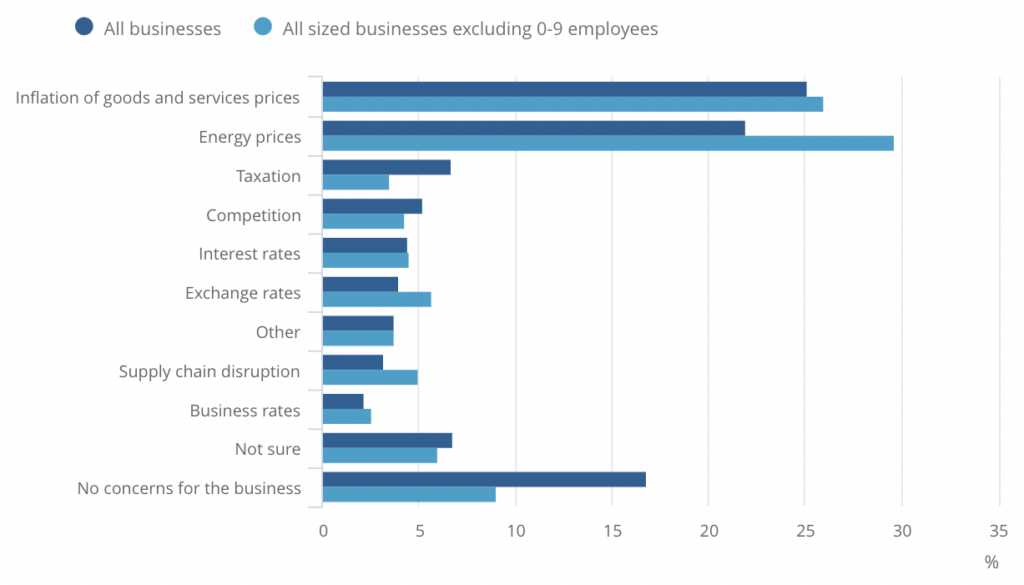 The severity of these problems is laid bare in the ONS’s Business Insights and Conditions Survey – a fortnightly survey of around 10,000 businesses. Respondents were asked, “Which of the following, if any, will be the main concern for your business in November 2022?” Results are shown below.