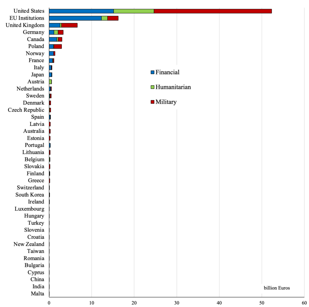 This equates to roughly 60% of annual Russian military spending. However, the figures are not directly comparable since Russian spending includes salaries as well as equipment, and about 40% of military aid to Ukraine is classified as “financial commitments” (e.g., to purchase weapons in the future).