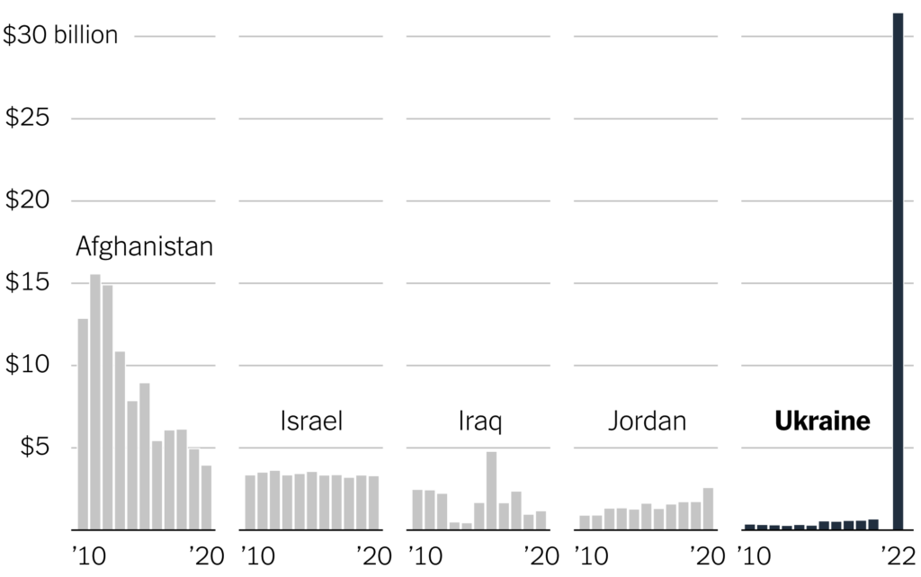 During the period 2014–2021, the US gave Ukraine roughly $2.5 billion in military aid. Already by May of this year, it had given Ukraine more than twice as much as it gave to Afghanistan in any year between 2010 and 2020.