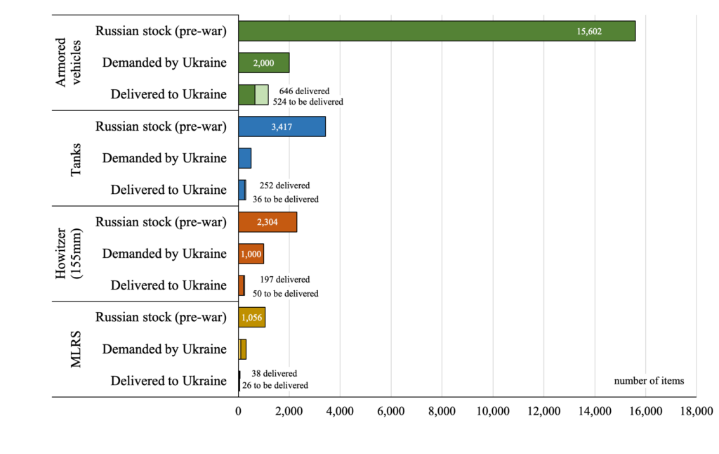 Of course, these numbers don’t include all the equipment Ukraine had pre-war. Looking at the IISS Military Balance 2022, we see that Ukraine had 850 main battle tanks; 2,300 armoured vehicles; 750 howitzers; and 350 MLRS. If we add these to the Western-supplied units, we see that within each category Ukraine still has less than half the pre-war Russian numbers.