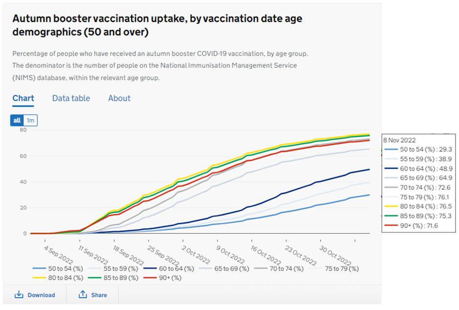 Figure 1 shows the take up of the Autumn Booster campaign by age. In the 50-54 age-group only 29.3% have take up the option so far. In the over-70 age groups about 25% of those eligible have declined. Who would have predicted that two years ago? What do these figures say about trust in the health authorities?