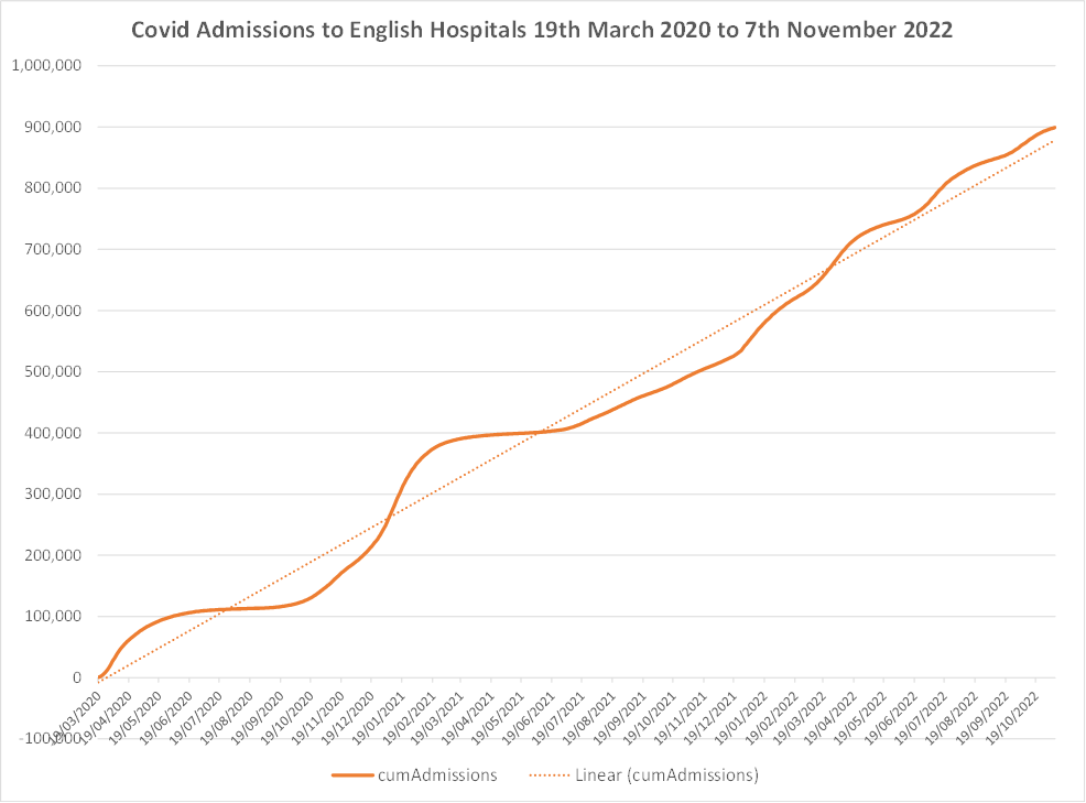 Should we be surprised at this collapse in demand for Covid vaccines? Probably not. Figure 2 shows cumulative Covid Hospital admissions from March 19th 2020 to November 7th 2022. You can see that hospital admissions in recent months are running above the trend line – clearly, mass vaccination hasn’t made much difference, at least on this metric.