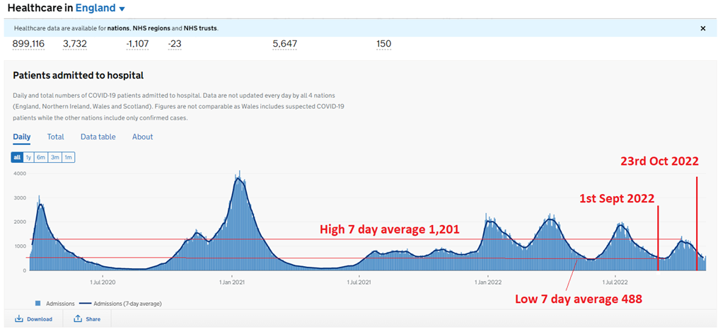 The week 44 UKHSA Vaccine Surveillance Report provides data on Covid hospital admissions from September 1st to October 23rd 2022. In the chart below I’ve highlighted in red the dates covered by the report. This period covered most of this autumn’s ‘wavelet’. During this period hospital admissions swung from a seven-day average low of 488 to a high of 1,201.
