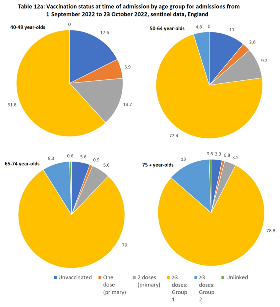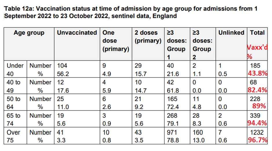 One thing is very clear from the charts, the unvaccinated are no more likely to be hospitalised than anyone from any of the other groups. Only 3.3% of those hospitalised in the over-75 age group were unvaccinated yet at least 5% of this age group are unvaccinated.
