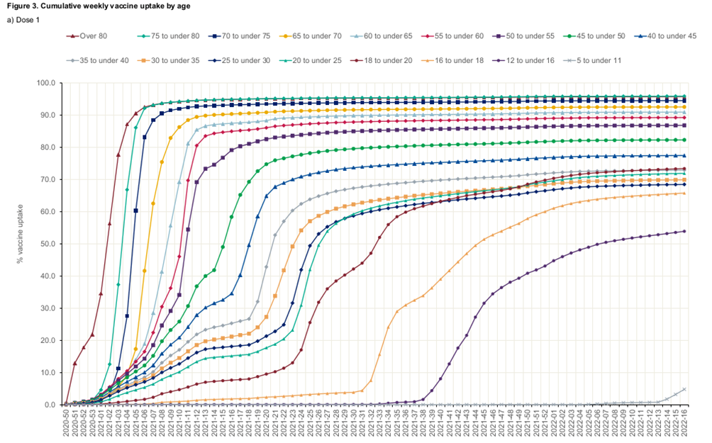 The UKHSA’s final graph of vaccine coverage in that April 2022 report showed that uptake had flatlined for most age groups.