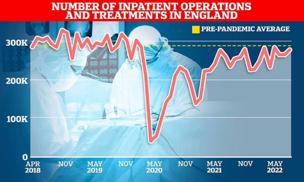 From April 2020 hospitals were moved to a block funding arrangement where they got paid the same regardless of activity. Previously their income was linked directly to the amount of treatments they provided. The incentive to productivity has been removed and staff have got used to doing less work.