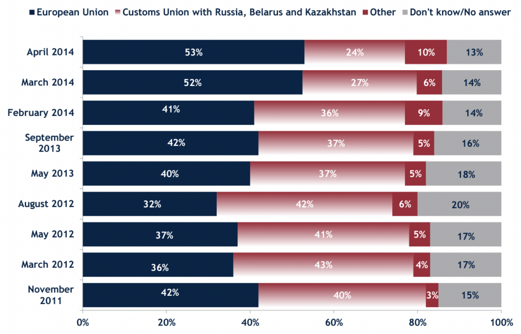 As late as February 2014, the percentage of Ukrainians who wanted to join the EU was only 5 points higher than the percentage who wanted to join the Eurasian Customs Union. The balance of opinion then shifted after the ‘Revolution of Dignity’.