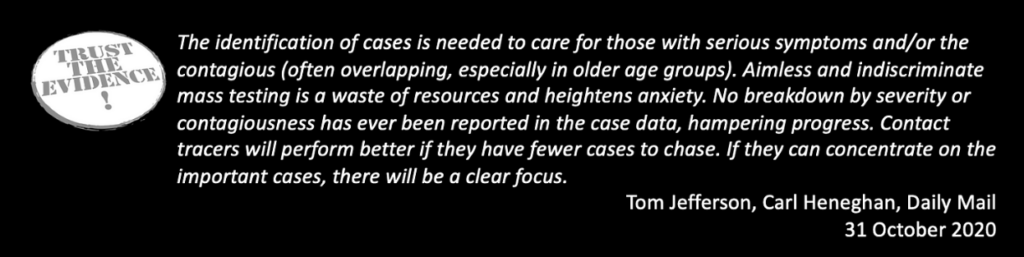 Except, as discussed in the third instalment of our transmission riddles, qualitative PCR (positive/negative) on its own without recourse to clinical history and an estimate of viral burden cannot distinguish between contagious, convalescent and spurious cases, i.e., due to environmental contamination. If you then set arbitrary cut-offs for positivity, as has been done in most U.K. laboratories, you increase the number of ‘cases’ by an unknown factor.
