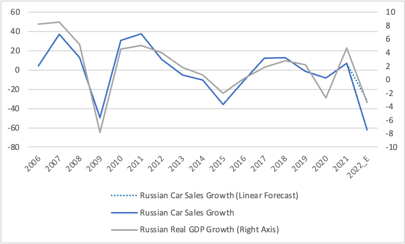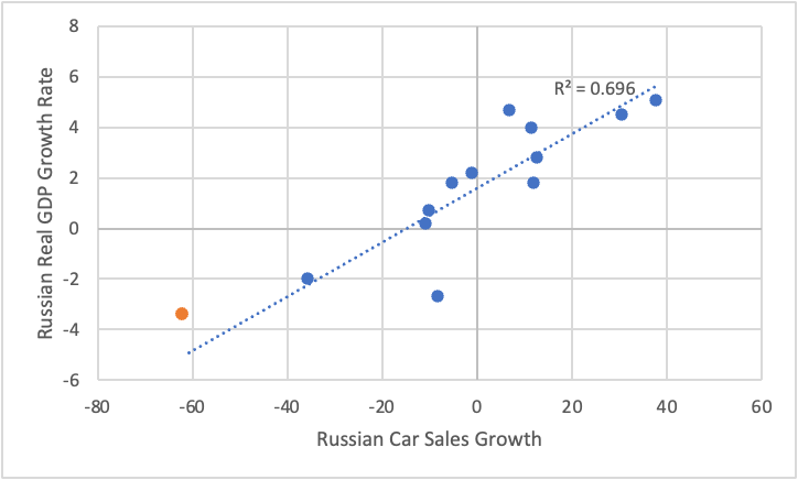 The first question to ask is: are Russians unable to buy new cars due to the sanctions? There are plenty of headlines about huge contractions in the Russian new car market, but they are obviously misleading. Why? Because the Russian economy has fallen into recession since the invasion. So some of the contraction of demand for cars is simply due to the larger economic contraction.