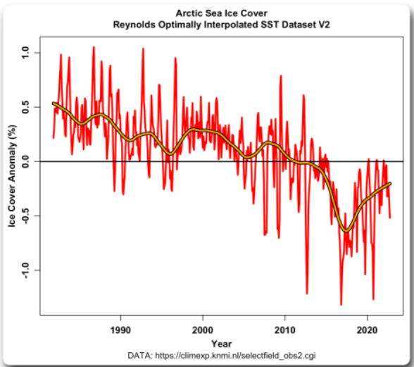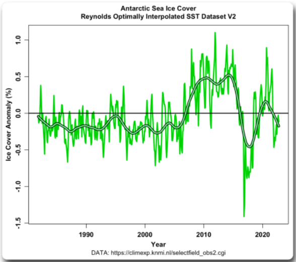 The above graph shows changes in Arctic sea ice cover during the satellite era. Values are anomalies from the 1991-2020 average. Eschenbach notes that since around 1990, people have been talking about how human-emitted carbon dioxide is reducing the amount of Arctic sea ice. When it started dropping very fast, there was talk we’d passed a ‘tipping’ point from which the ice would never recover. Over this time, noted Eschenbach, predictions of an ice-free Arctic ocean abounded.