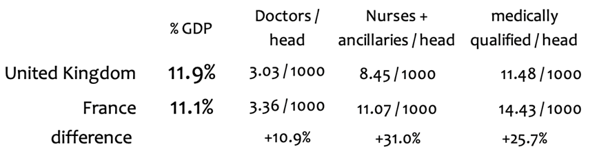 Interesting article. Worth pointing out perhaps that, in addition to more medical staff per 1000 population, French life expectancy is marginally greater than that in the UK.
