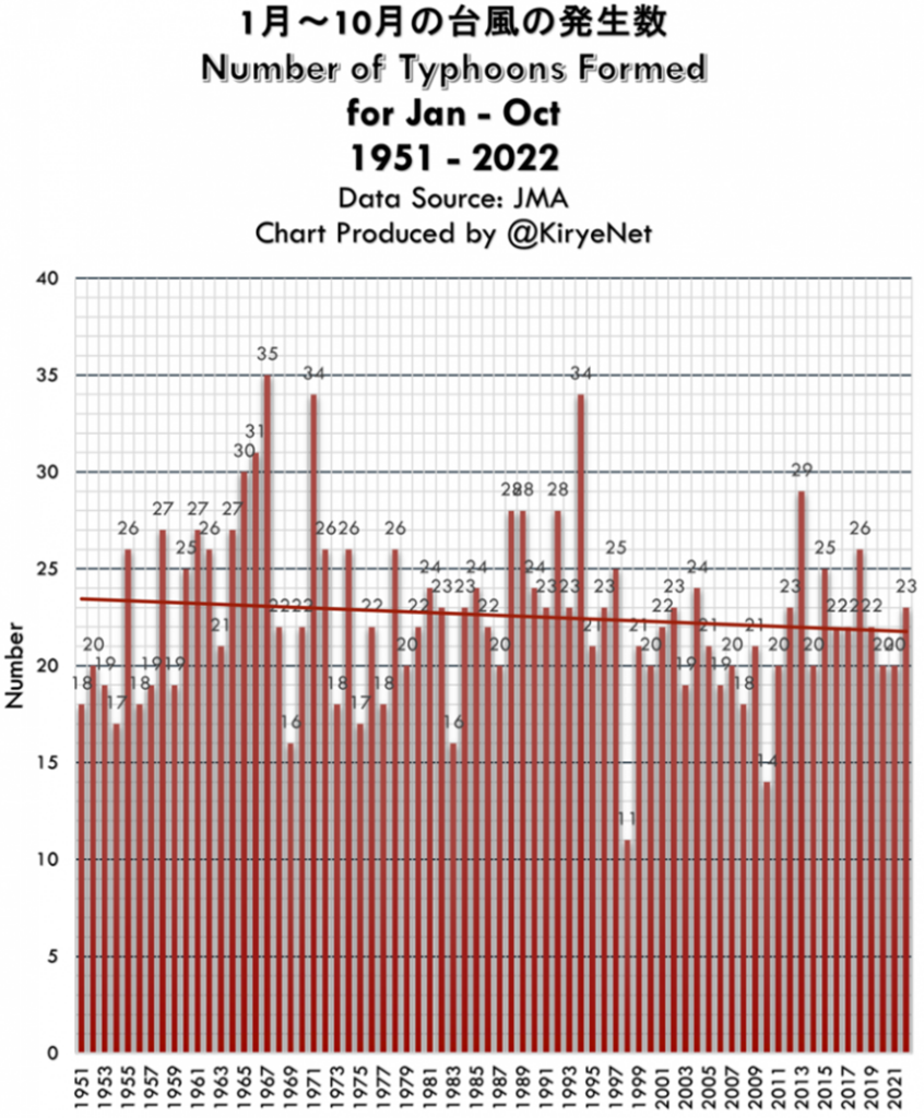 Meanwhile, over in Asia the latest figures for Pacific typhoons are said to show a continuing downward trend. Reporting on the latest figures from the Japanese Meteorological Agency (JMA), the climate science site No Tricks Zone says alarmist are “baffled” and “embarrassed”.