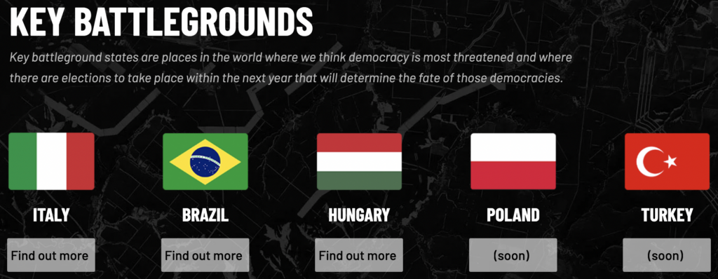 On the “Where do we help” section of its website, Action for Democracy lists five “key battlegrounds”, which all happen to be countries with nationalist/populist governments.