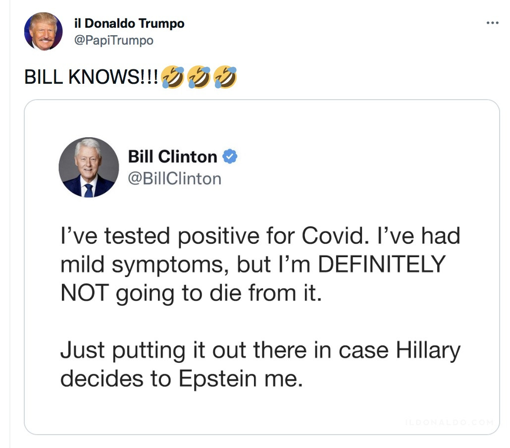 Bill Clinton announced on Twitter on Wednesday night that he’s caught Covid – and, of course, the announcement was accompanied by the ritual guff about how grateful he is for the fact that he’s quadruple jabbed because otherwise it would be so much worse!