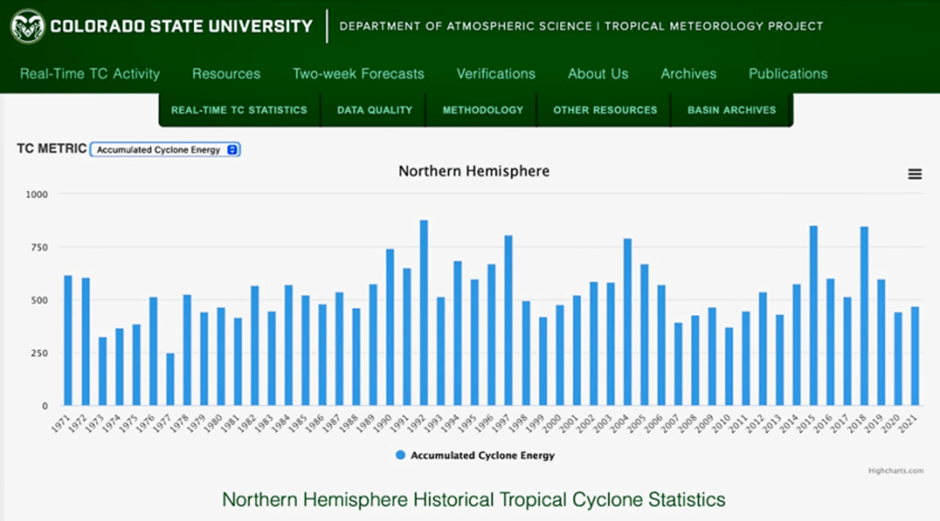 More details are emerging about an astonishing drop in cyclonic storm energy across the northern hemisphere during 2022. The latest calculations from Colorado State University show a 33% below-trend fall in its Accumulated Cyclone Energy (ACE) index, which reflects frequency, intensity and duration of all hurricane and tropical cyclone data. Curiously, this crucial fact seems to have gone missing in much of the mainstream media’s half-hearted commentary on a ‘below average’ North Atlantic hurricane season. Describing what it calls a “unique” and “near average” season, BBC Weather Simon King failed to even mention the enormous drop in cyclonic energy. In September, the BBC “Reality Check” was running the party line that evidence showed hurricanes were “getting more powerful”.