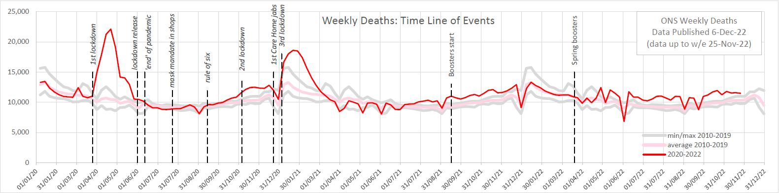 I have always compared weekly deaths with the average of 2010-2019 adjusted to 2019 population levels. This puts a baseline outside the goings-on from 2020 onwards. On a timeline with salient dates, it is abundantly clear to see what is going on. See here.