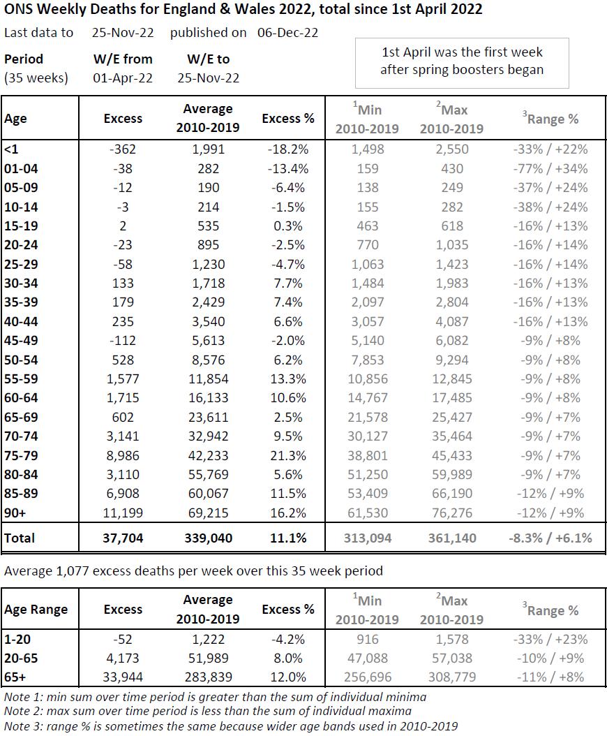 Since 1st April 2022, with the spring booster, deaths are up 11.1% above the 2010-2019 average (those years adjusted for population). January to March was normal.