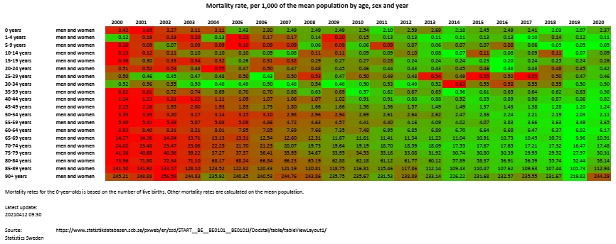 Overall mortality by age group is very useful as a check on hysteria. Sweden’s mortality does not seem at all bad by historical standards, even in 2020 without the miraculous vaccines. As with other contributors, I have used red for ‘bad’ and green for ‘good’.