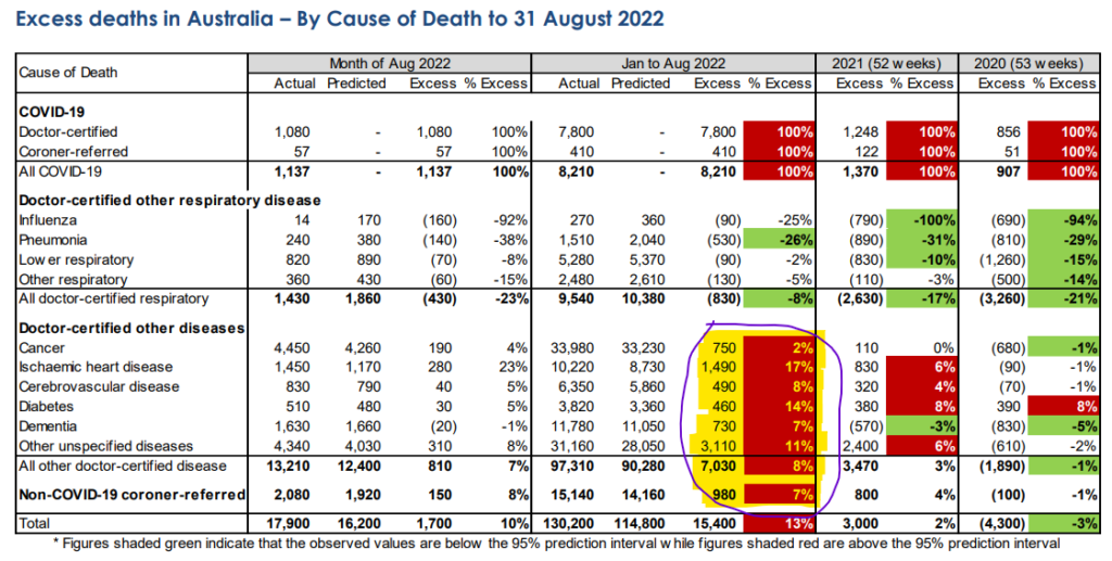 According to the raw data released by the Australian Bureau of Statistics, there were 128,797 deaths from January 1st to August 31st, which was 18,671 or 17% higher than the historical average. Of those, 7,727 or 41% were attributed to Covid, leaving 10,944 non-Covid excess deaths.