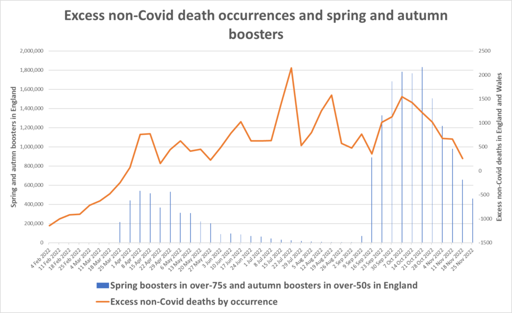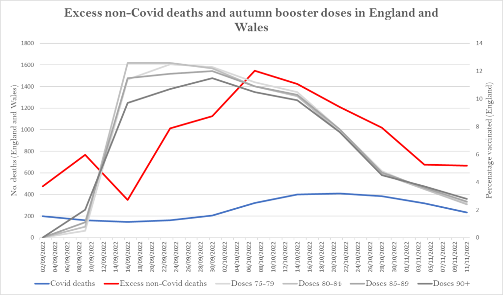 The latest data from England and Wales show that there have now been 25,918 excess non-Covid deaths since April. In the week ending November 25th, the most recent week for which figures are available, there were 11,483 deaths, which is 778 or 7.3% above the five-year average, according to figures from the ONS. Of these, 215 are due to Covid (as underlying cause) leaving 563 from an underlying cause other than COVID-19. A possible link with the vaccine booster campaigns may be observed in the charts below, which show booster vaccinations and deaths by date of occurrence.