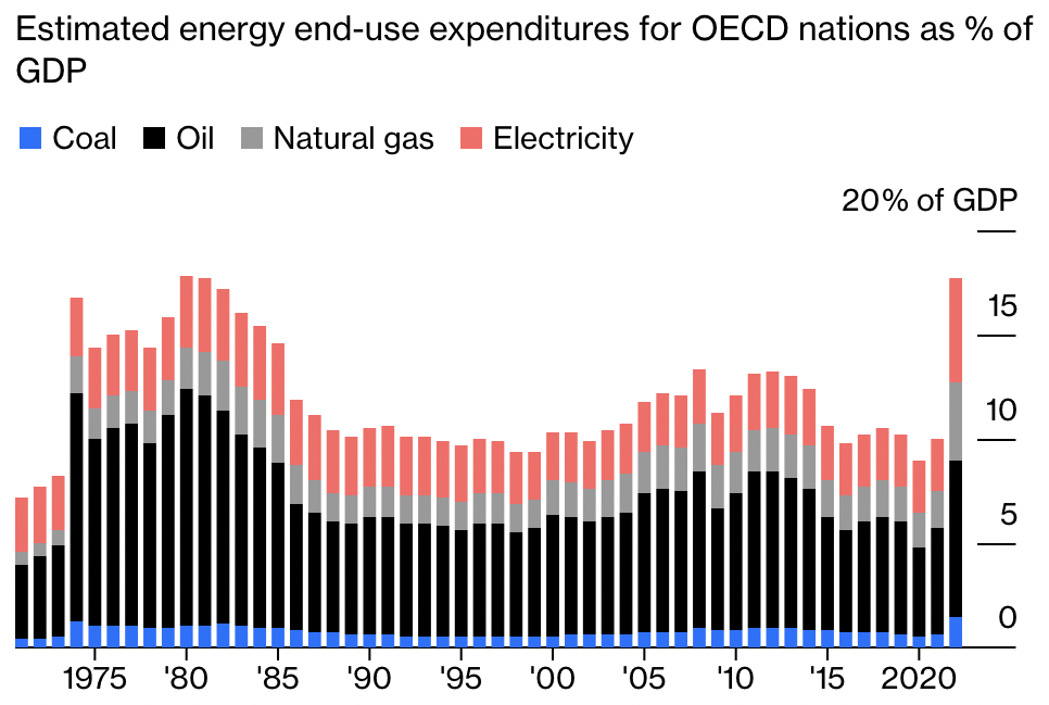 Of course, changes in the price of “Dutch TTF gas futures” are hard for most people to interpret (including myself). A more digestible – and more comprehensive – statistic is the percentage of GDP that we spend on energy. This is shown in the chart below, taken from Bloomberg’s energy man Javier Blas.