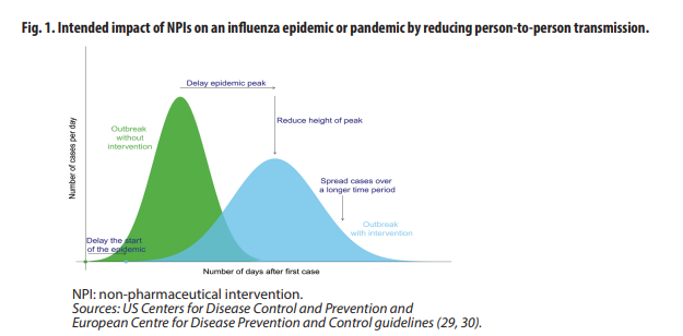 The purpose was also the same: to ‘flatten the curve’ to wait for a vaccine, as illustrated in the diagram below. The WHO guidance states: “NPIs are often the most accessible interventions, because of the time it takes to make specific vaccines available”; “specific vaccines may not be available for the first six months”; NPIs are “used to delay the peak of the epidemic… allowing time for vaccines to be distributed”.