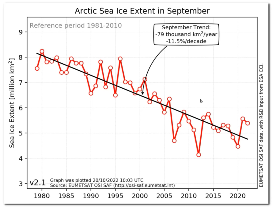 The Daily Sceptic has written a number of articles of late noting that summer sea ice extent in the Arctic is recovering. In Greenland, I recently reported, the ice sheet may have increased in the year to August 2022. Invariably, social media commentators reply by publishing the sea ice graph below, compiled by the U.S. National Snow and Ice Data Center (NSIDC).