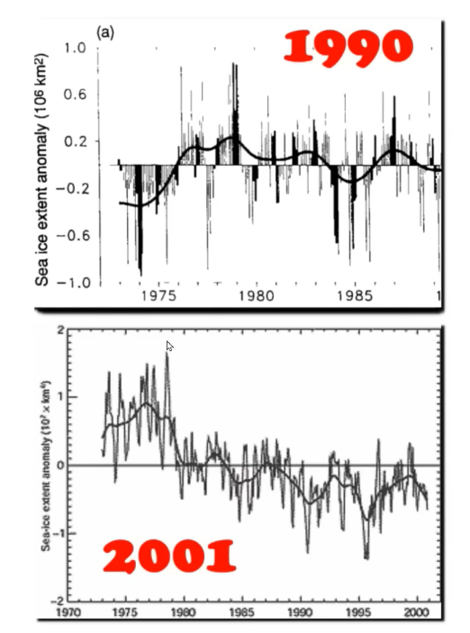 This ‘hidden’ data is clearly shown above in a graph from the first IPCC report in 1990. The lower levels of ice in the 1970s are plotted and the peak is 1979. But by 2001, the IPCC had removed much of the increase of that decade, and now the chart shows the ice actually starting to fall from 1975. Heller also provides evidence that the 1950s, which are not shown on these charts, had lower sea ice than the 1970s, meaning the 1970s were a recent peak. He goes on to note that the 2001 IPCC report also saw the publication of the ‘hockey stick’ temperature graph that became notorious for removing the medieval warm period.