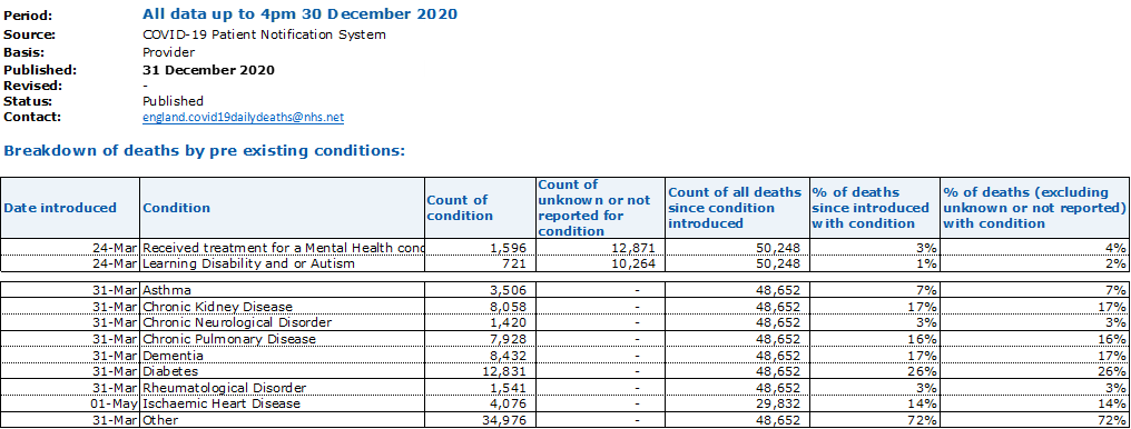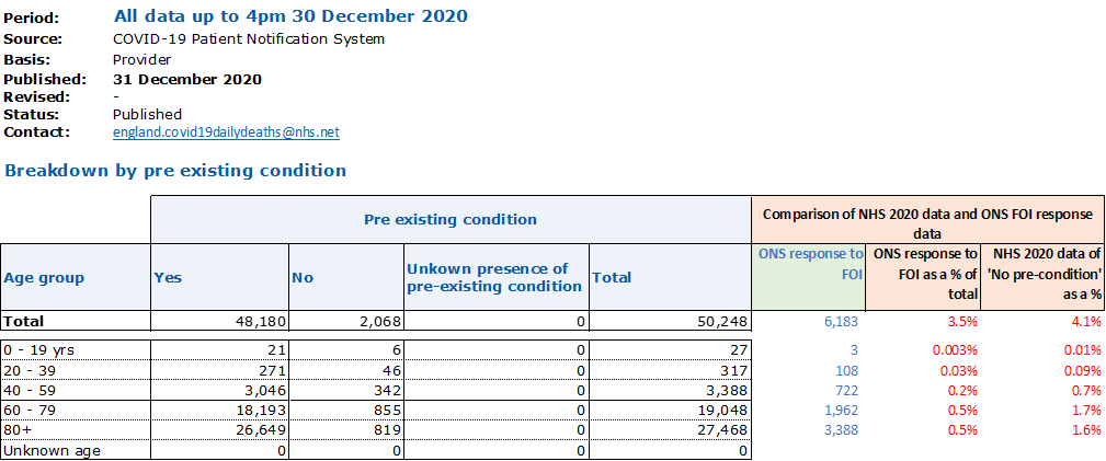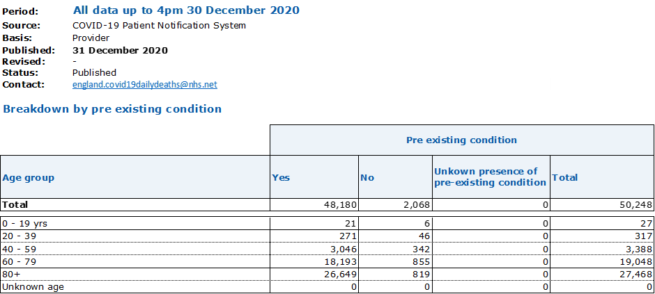 To be clear, these data differentiate deaths by age group between those with and those without a pre-existing condition. We can see that total deaths in English hospitals up to Dec 30th 2020 was 50,248. Of these, only 2,068 or 4.1% had no pre-condition, of whom only six were under 20.