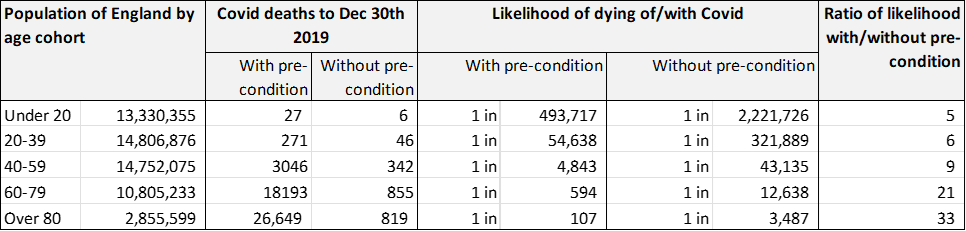 In Table 3 I’ve added some population data so you can see the likelihood of someone in the various age cohorts succumbing to Covid in the period covered by the report. A healthy under 20 year-old had a 1 in 2,221,726 chance of dying of Covid while an under 20 with a pre-condition had a 1 in 493,717.