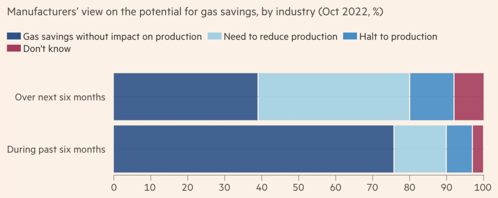 About 20% of manufacturers said they needed to reduce or halt production over the past six months. Yet more than 50% said they will need to do so over the next six months. There are only so many ways you can adapt to high gas prices before cutting output becomes unavoidable.