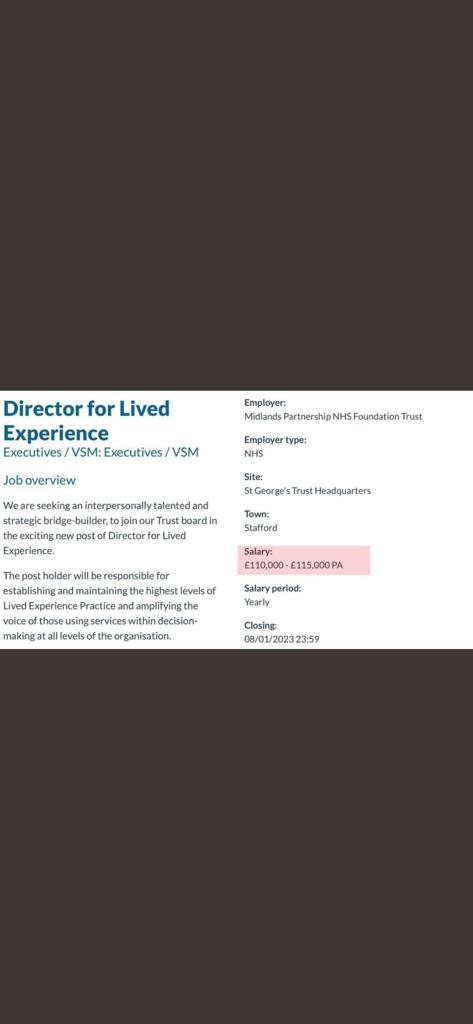 Salary £110,000 – £115,000. Very tasty. I have no real idea what “lived experience” means in this context but I expect it is bullshit, whatever it is.