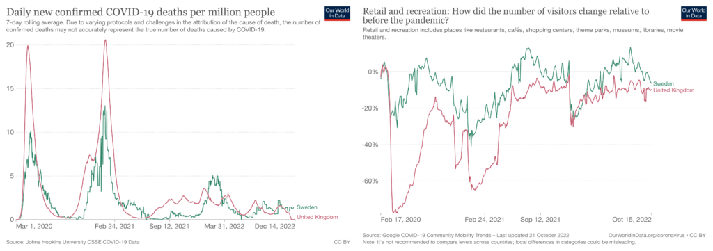 It’s often claimed that Swedes locked down voluntarily by drastically reducing their time spent outside. But this simply isn’t true, as Google mobility data shows (right-hand chart above). Swedes reduced their time spent on retail and recreation by only a quarter as much as Brits.