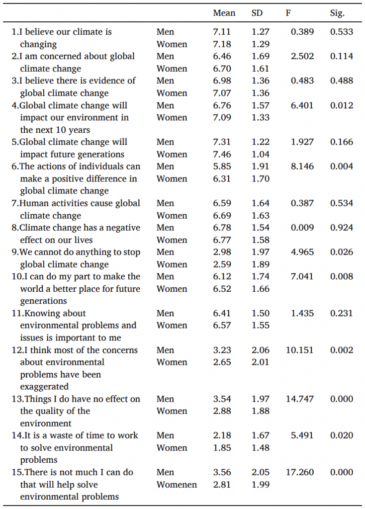 As you can see, some of the items (e.g., 1, 2 and 3) deal with whether climate change is happening, while other items (e.g., 10, 11, 12) deal with whether individual actions can make a difference.