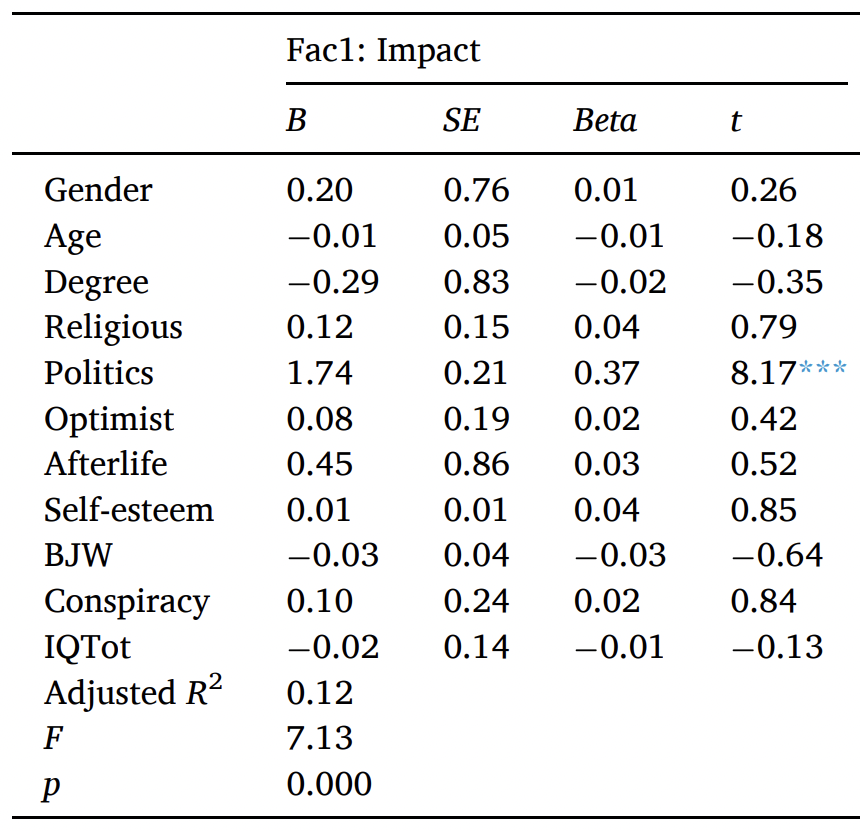 When the researchers carried out a multivariate analysis of people’s attitudes (by including many different predictors in the same model) they found that political views was the only statistically significant predictor. This is shown in the table below: