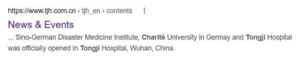 A Google search result from the Tongji website (see below) tantalisingly notes that a “Sino-German Disaster Medicine Institute, Charité University in Germay [sic.] and Tongji Hospital, was officially opened in Tongji Hospital, Wuhan, China”. But the indexed Tongji news article is not available nor is it cached, and the URL is not archived by the Wayback Machine either. Could this be the event at which Drosten is pictured? Perhaps Drosten could clarify.