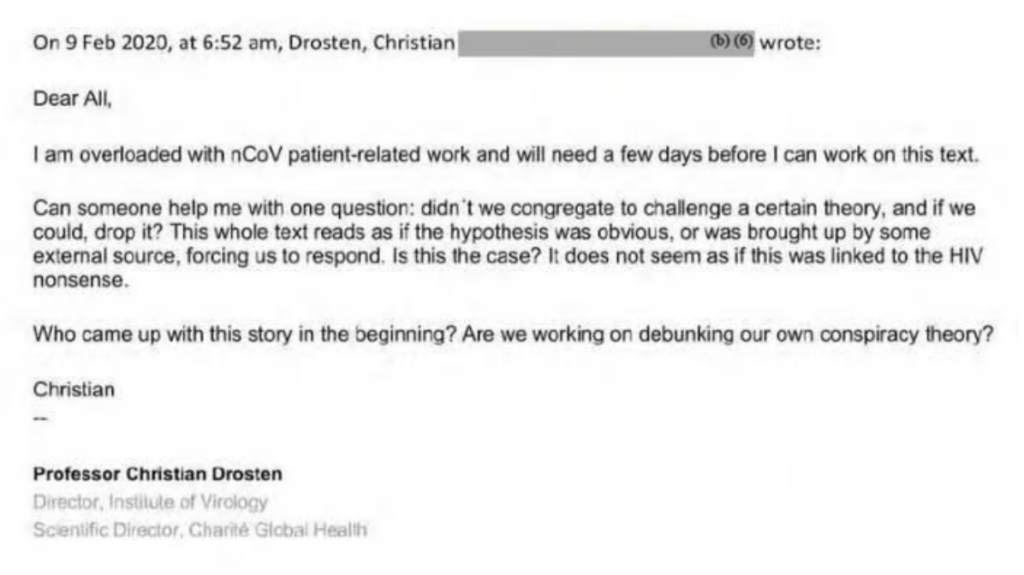 In any case, thanks to an FOIA request, we know that Drosten participated in February 2020 email exchanges with Anthony Fauci and other international scientists about the possibility of a lab leak and that he was in fact, in contrast to other participants, particularly irritated about the hypothesis. Several of the others – including, n.b., Anthony Fauci – are clearly willing to entertain the possibility of a lab leak, and Jeremy Farrar of the Wellcome Trust even says that he is split 50:50 between lab leak and natural origin and that Edward Holmes of the University of Sydney is even 60:40 lab leak.